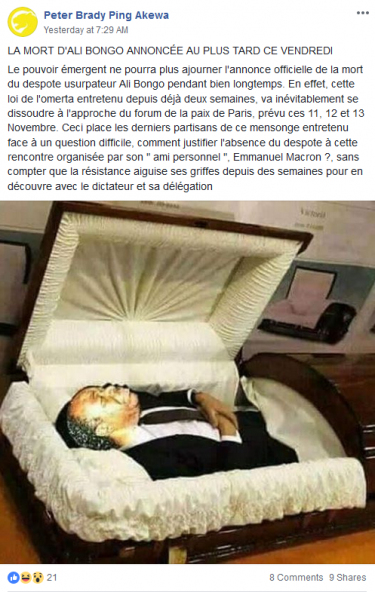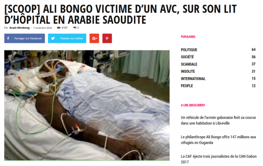 Premier exemple illustrant les rumeurs à ce sujet : une vidéo de la chaîne de télévision Gabon 24, où l’on voit le journaliste, Jean Pascal N’dong Obiang, et l’ambassadeur du Gabon en France, Flavien Enongoue. Publiée le 6 novembre sur Facebook et YouTube, elle comptabilisait déjà plus de 82 000 vues 24 heures plus tard.