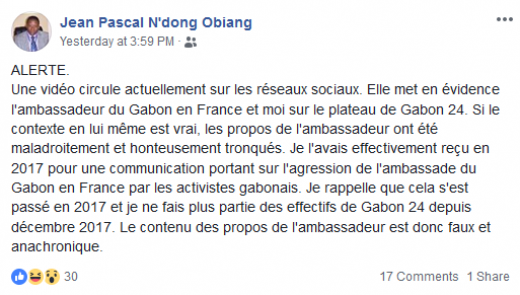 Le journaliste Jean Pascal N’dong Obiang a d’ailleurs confirmé sur son compte Facebook que cette vidéo avait été truquée, rappelant qu’il ne travaillait plus pour Gabon 24 depuis décembre 2017. On ignore toutefois qui est à l’origine de ce montage grotesque.