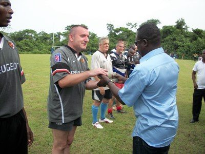 Après ces deux rencontres, Habib Charles Owono, président de l’Association Gabonaise du Rugby (AGR) et futur président de la ligue, ainsi que les présidents des clubs Jean Claude Baloche (RCO XV) et Jérôme Virefeu (RCG), ont, en présence de Pierre DURO (le coordonateur du Rugby au Gabon), remis un « présent » au président du nouveau né « ARC XV », Grégoire Kouna (voir photo rugby n°1), qui, à son tour, à remis ledit « présent » à Michel, l’entraineur de l’équipe de la GR (voir photo rugby n°2).