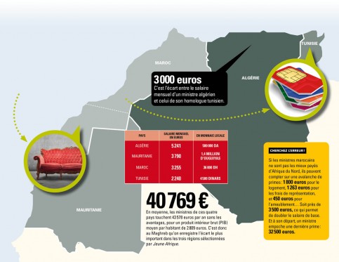 La Mauritanie est l’exception qui confirme la règle. Ses ministres sont mieux payés que leurs homologues marocains et tunisiens, malgré un produit intérieur brut très inférieur. La raison ? Le salaire comprend aussi tous les frais de missions et de représentation ainsi que les indemnités de logement. Reste que ces salaires sont assez proches, finalement, de ceux relevés dans les pays du reste du continent, et surtout bien inférieurs aux salaires des dirigeants des grandes entreprises.