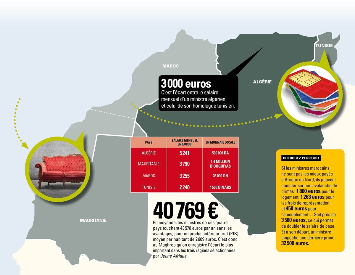 Logiquement, les ministres du premier producteur de gaz du continent, l’Algérie, arrivent en tête des rémunérations maghrébines, avec 5 167 euros par mois. Sinon, globalement, les émoluments des gouvernements nord-africains sont assez homogènes.
