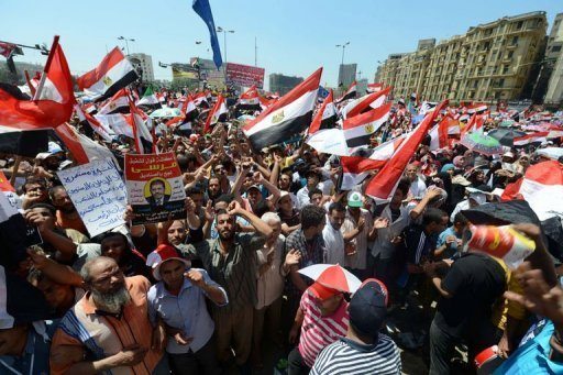 Des Egyptiens brandissent le drapeau national lors d’un rassemblement place Tahrir, au Caire, le 29 juin 2012 (AFP, Khaled Desouki)