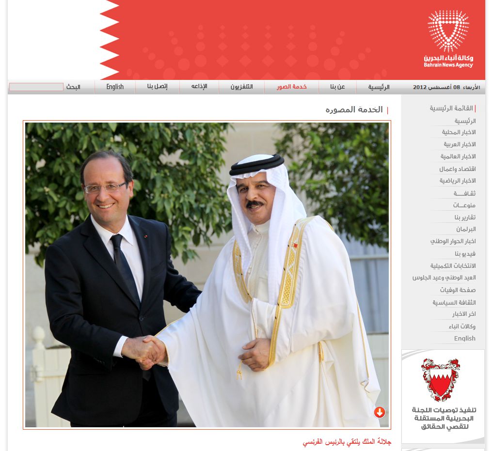 Tout sourire, François Hollande serre la pince au roi du Bahreïn sur le perron de l’Elysée. La photo, publiée par l’agence de presse officielle du royaume, rappelle celles de Nicolas Sarkozy en compagnie de Kadhafi, Moubarak ou Ben Ali avant la chute de leur régime respectif.