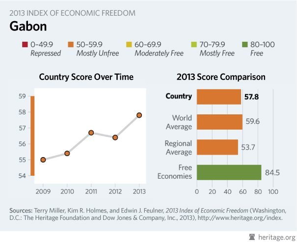 Au niveau mondial, le Gabon se positionne au 99eme rang sur 177 nations évaluées, entre la Tanzanie et le Brésil ; ce qui reflète par rapport à l’indice 2012 − ou le Gabon occupait la 113eme place sur 179 pays −une nette amélioration en ce qui concerne les critères suivants : la liberté d’investissement (45,0 points en 2012 contre 55,0 points en 2013 et au-dessus de la moyenne internationale à 52,2 points), la liberté de travail ( également en hausse de 3,3 points par rapport à 2012 et qui est 3,0 points au-dessus de la moyenne internationale) et enfin la lutte contre la corruption (28 points en 2012 contre 30 points en 2013).
