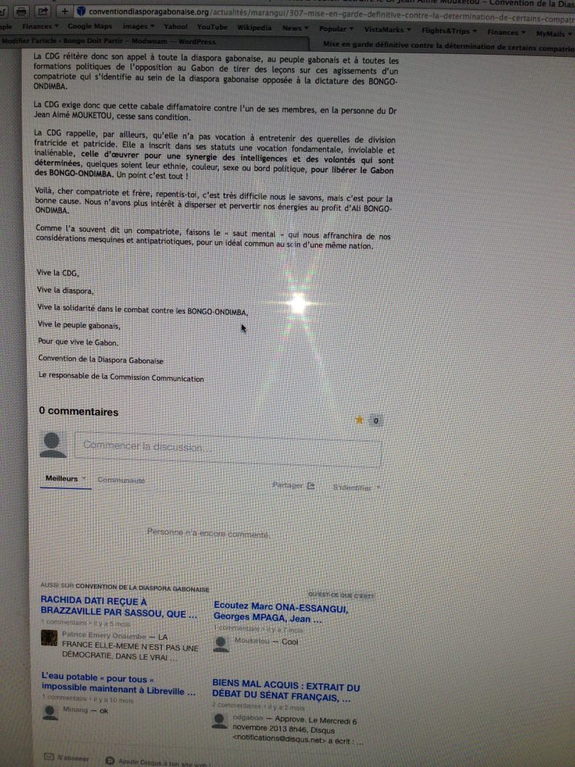 IMG_1556Si une telle haine et un tel acharnement nocif et gratuit continuent de régner au sein de la diaspora gabonaise, nous, CDG, lançons un appel au peuple gabonais et à toutes les formations politiques de l’opposition à constater la volonté d’un individu à entretenir la division, la diversion et la haine entre compatriotes qui ne veulent qu’une chose, CHASSER BONGO-ONDIMBA DE SON POUVOIR ILLÉGITIME.