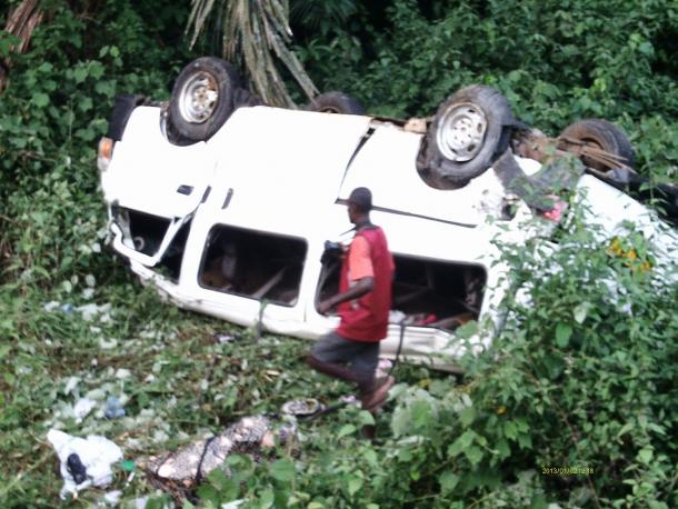 Un minibus Nissan de marque Urvan , immatriculé 46 01 G1Y en provenance de Libreville pour se rendre à Tchibanga, ayant à bord 12 passagers s’est retrouvé aux environs de 17 heures près du village Ditounga situé à 38 km de Mouila, les quatre roues en l’air à l’issue de plusieurs tonneaux.