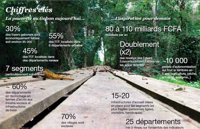 Ainsi, selon le rapport final intitulé «Stratégie d’investissement humain du Gabon», «le Gabon présente une importante proportion de Foyers économiquement faibles percevant moins de 80 000 FCFA par mois. Ces Gabonais sont aujourd’hui environ 95 000, soit 30% de la population gabonaise qui perçoit des revenus sept fois inférieurs à la moyenne nationale. L’analyse de ces foyers révèle sept segments particulièrement fragiles : les familles avec enfants (comprenant aussi les familles monoparentales), les mères célibataires, les personnes âgées, les veuves, les personnes handicapées, les étudiants isolés, et les orphelins et enfants des rues».