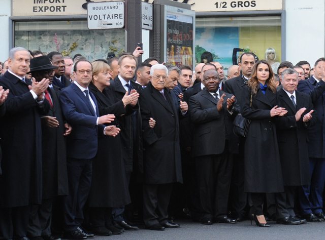 En tête du cortège, le président français, François Hollande accompagné entre autres de la chancelière allemande Angela Merkel, le Premier ministre britannique David Cameron, l’Italien Matteo Renzi, l’Espagnol Mariano Rajoy. Le roi Abdallah de Jordanie, le président palestinien Abbas étaient dans le même carré du cortège VIP ultra-scurisé que le premier ministre israélien, Benyamin Netanyahou. Fait rarissime sur le plan diplomatique, et remarquable compte tenu du souci de sécurité des israéliens, sans oublier le ministre russe des Affaires étrangères, Lavrov, le président ukrainien, Petro Porochenko.