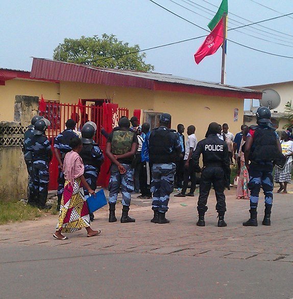 UPG-police-1Bruno Ben Moubamba, président élu de l’Union du peuple gabonais (UPG) mais contesté par le Secrétaire exécutif du parti, Mathieu Mboumba Nziengui, a affirmé sur sa page facebook que la descente musclée de la police jeudi au siège du parti avait pour but de l’assassiner et non de l’en expulser.