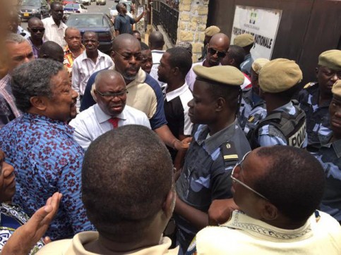 Solidaires de leurs militantes justement, les leaders du «Front», ainsi des figures charismatiques de la société civile et d’autres partis de l’opposition, se sont radinés au siège de la PJ, bien gardé par les éléments de la police anti-émeute, en vue de s’enquérir de la situation. Le siège des lieux s’est étendu jusqu’en début de soirée avant que les leaders ne décident de se retirer. Dépité, le président du Front de l’opposition pour l’alternance a dénoncé des irrégularités de procédure. «Nous nous retirons. Aucun acte de procédure n’a été posé de manière régulière puisque les avocats n’ont pas été admis. L’état de droit se referme (…) Nous ne pouvons pas abandonner nos militantes et nous rappliquerons demain (19 avril)», a déploré Jean de Dieu Moukagni Iwangou, alors que dans le même temps, plusieurs militants voulaient en découdre avec les forces de l’ordre.