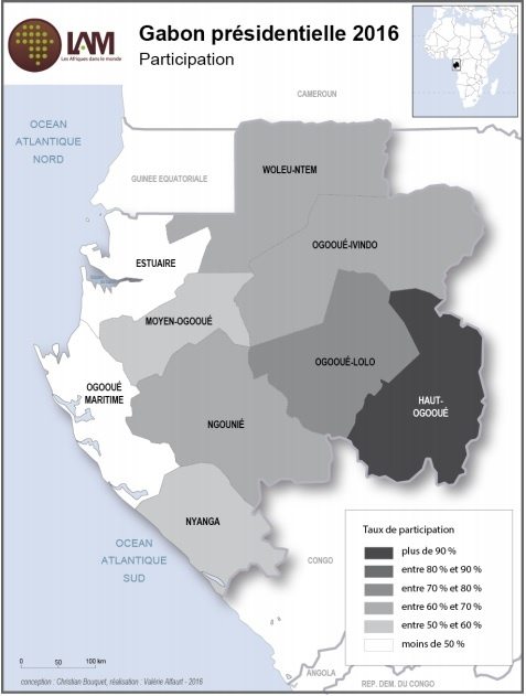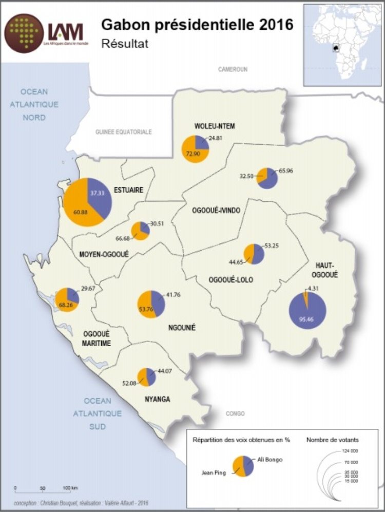 Résultats des élections présidentielles au Gabon de 2016. Données de la CENAP (Commission électorale nationale autonome et permanente) contestées par l’opposition. Réalisation par Christian Bouquet et Valérie Alfaurt.