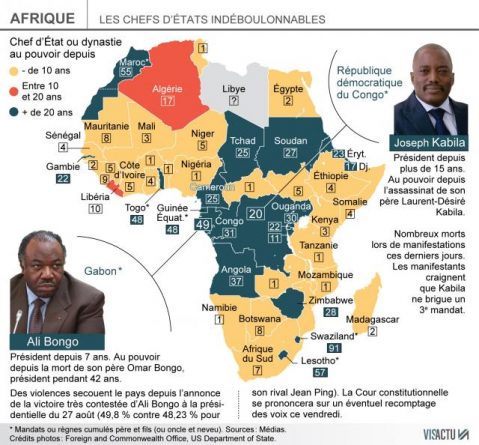 Tout près, José Eduardo Dos Santos est en place depuis 37 ans en Angola, Denis Sassou-Nguesso depuis 31 ans au Congo-Brazzaville, Yoweri Museveni (Ouganda) depuis 30 ans, Robert Mugabe (Zimbabwe) depuis 28 ans, Omer el-Béchir (Soudan) depuis 27 ans, Paul Biya (Cameroun) et Idriss Déby (Tchad) depuis 25 ans …