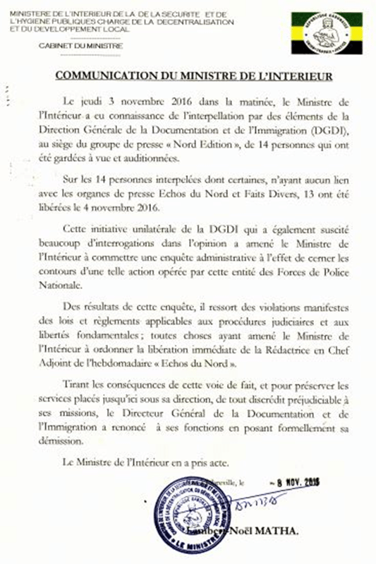 Au terme de celle enquête, il est ressorti que des violations manifestes des lois et règlements applicables aux procédures judiciaires et aux libertés fondamentales avaient été observées au cours de cette action. Toutes choses qui avaient amené le ministre, à ordonner la libération immédiate de la rédactrice en chef adjoint de l’hebdomadaire Echos du Nord.