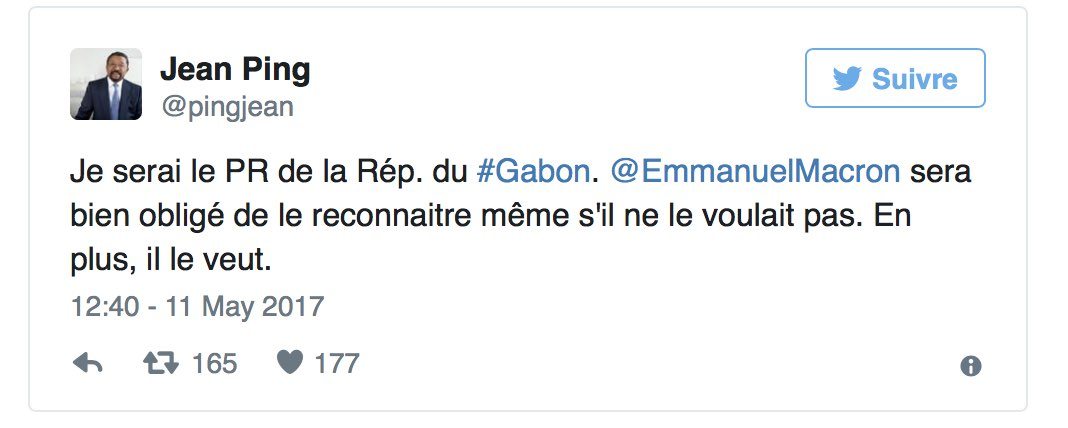 Jean Ping, qui refuse toujours de reconnaître la réélection d’Ali Bongo au scrutin présidentiel du 27 août, avait félicité dès le 7 mai Emmanuel Macron pour son élection, se présentant en tant que président élu du Gabon.