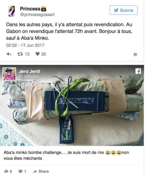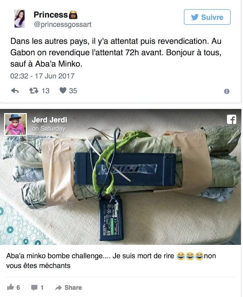 Les « bombes » artisanales du terroriste politique présumé Roland Désiré Aba’a Minko inspirent visiblement les internautes. Depuis vendredi après-midi où il s’est finalement rendu sans opposer de résistance quelques heures seulement après avoir affirmé poser des bombes dans la capitale gabonaise, les internautes gabonais usent désormais de créativité et d’humour pour moquer ce « terroriste » éphémère, devenue la risée des réseaux sociaux.