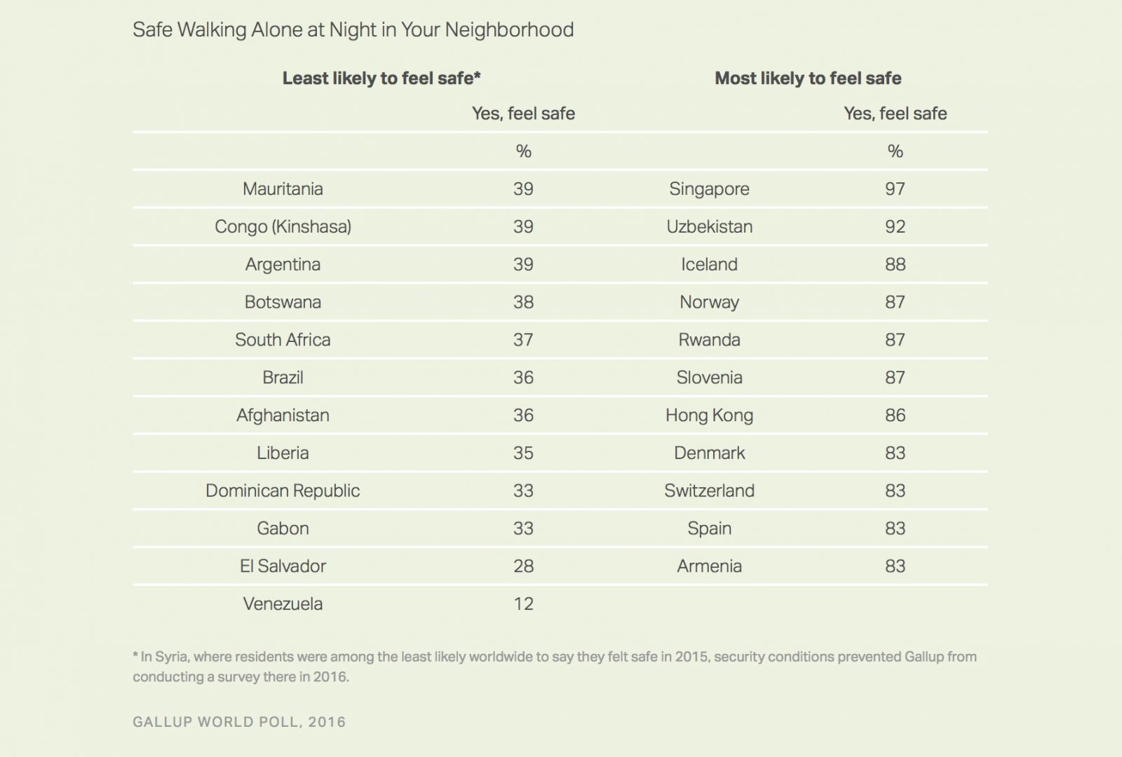 « Seuls 12 % des Vénézuéliens se sentent en sécurité en marchant dans les rues la nuit… » Mais ils ne sont pas les seuls. Dans le monde entier, le sentiment de sécurité varie grandement, en fonction du pays où on habite. Chaque année, la société de sondages Gallup, basée aux États-Unis, établit son « index sur la loi et l’ordre », à partir d’une enquête menée dans 135 pays du monde.