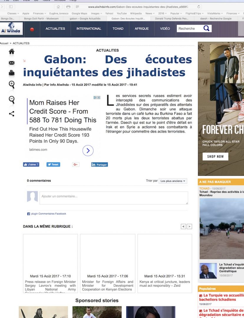 Les services secrets russes estiment avoir intercepté des communications des Jihaddistes sur des préparatifs des attentats au Gabon. Dimanche soir une attaque terroriste dans un café turke au Burkina Faso a fait 20 morts plus les deux terroristes abattus par l’armée. Daech qui est sur le point d’être défait en Irak et en Syrie a actionné ses combattants à l’étranger pour commettre des actes terroristes.
