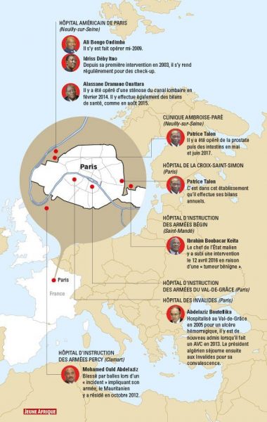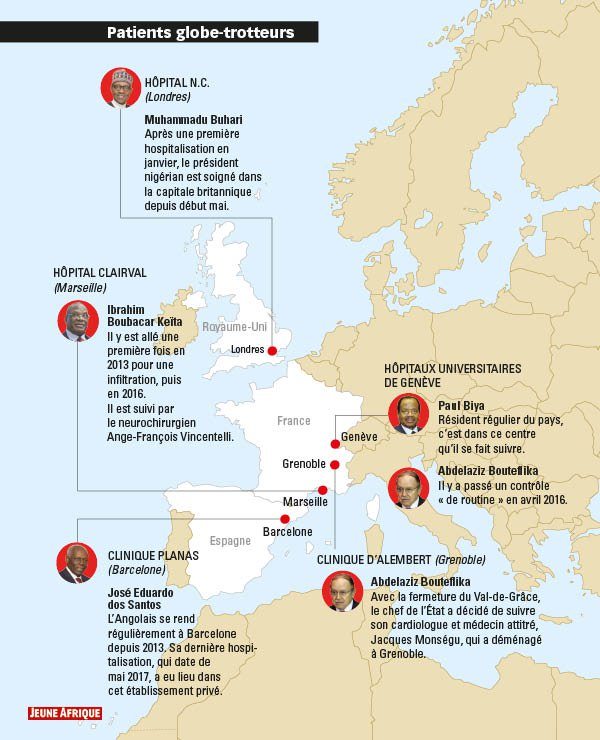Citons pêle-mêle Muhammadu Buhari, rentré depuis peu de Londres après y être resté plus de cent jours sans avoir fourni la moindre explication crédible, Abdelaziz Bouteflika, retranché dans sa résidence de Zeralda d’où aucune information ne sort, Robert Mugabe, dont l’âge (93 ans), les siestes en public et les alopécies inexpliquées posent question, ou encore le départ annoncé de José Eduardo dos Santos après les élections du 23 août, alors que ses séjours dans divers établissements de Barcelone se sont multipliés ces dernières années.