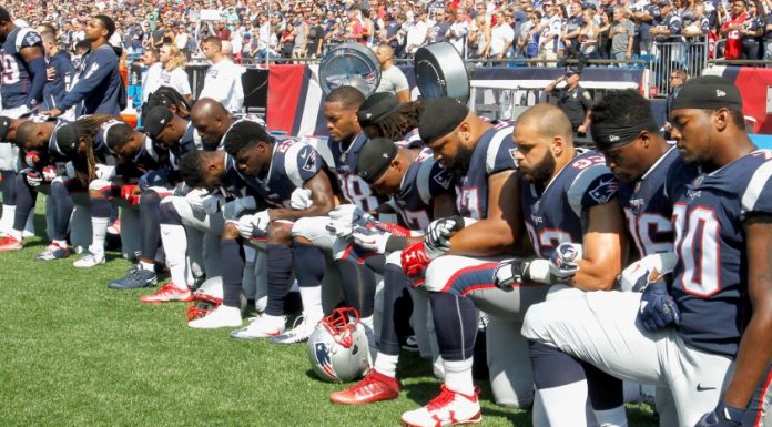 Mais à Foxborough, ce dimanche après-midi, 15 joueurs des New England Patriots, champions en titre de la NFL, se sont agenouillés et nombre d’entre eux se tenaient par les bras, dont la star de l’équipe Tom Brady.