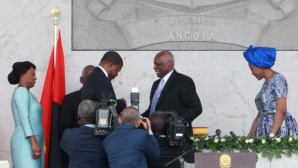 Après la prestation officielle du nouveau président João Lourenço et de son vice-président, l’ancien chef d’Etat angolais a passé le témoin au nouveau. Un geste symbolique, mais historique, après 38 ans de présidence. José Eduardo Dos Santos a passé autour du cou de son successeur le collier et la médaille présidentiels, ponctué d’une chaleureuse poignée de main entre les deux hommes.