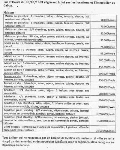 A l’occasion de la célébration, le 2 octobre, de la Journée mondiale de l’Habitat, il serait opportun que les autorités s’intéressent à la question, et qu’elles réfléchissent à une véritable réglementation du loyer locatif au Gabon. Il s’agira notamment de veiller à la mise en application et au respect de la loi n°15/63 du 8 mai 1963 régissant les locations et l’immobilier en République gabonaise. Adoptée peu après l’accession du Gabon à l’indépendance, cette loi, qui n’a jamais vraiment été appliquée, est une sorte de «mercuriale» des prix du loyer. On peut y lire que les maisons en planches vont de 50 000 à 90 000 francs/mois ; les studios en dur de 75 000 à 85 000 francs/mois ; les maisons en dur de 100 000 à 300 000 francs/mois ; et les résidences de 700 000 à 1,5 millions de francs/mois.