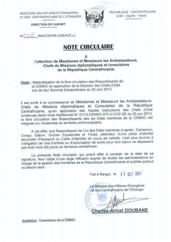 Les ressortissants des pays de la Cemac (Cameroun, Congo-Brazzaville, Gabon, Guinée Équatoriale, Tchad) « détenteurs d’une pièce d’identité sécurisée en cours de validité » sont donc autorisés à entrer en Centrafrique à compter du 12 octobre 2017 sans visa d’entrée « pour tout séjour ne dépassant pas trois mois », détaille encore le texte.