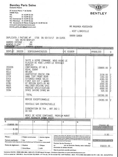 Sur le site Matindafrique.com, notre confrère évoque en effet l’achat par Pierre-Claver Maganga Moussavou d’une Bentley Continental GT S8 facturée à 103 millions de francs et d’une Mercedes-Benz à 50 millions de francs. «Achetés en France, précise le journaliste qui vit sur place, les deux premiers véhicules ont déjà été livrés au vice-président d’Ali Bongo, tandis que la dernière commande est attente.» Il s’agirait d’une Porsche Cayenne estimée à 500 millions de francs.