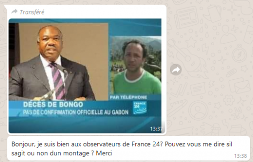 Premier exemple illustrant les rumeurs à ce sujet : une vidéo de la chaîne de télévision Gabon 24, où l’on voit le journaliste, Jean Pascal N’dong Obiang, et l’ambassadeur du Gabon en France, Flavien Enongoue. Publiée le 6 novembre sur Facebook et YouTube, elle comptabilisait déjà plus de 82 000 vues 24 heures plus tard.