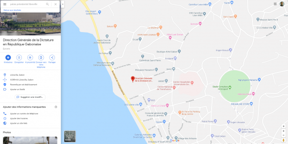 Google Maps réserve parfois des surprises. À Libreville, le site mentionne, en lieu et place du palais présidentiel, une fictive « Direction générale de la dictature en République gabonaise ».