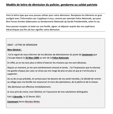Voici la lettre type que nos policiers, gendarmes et soldats peuvent utiliser pour leur démission. Remplacez les éléments en gras souligné avec l’information qui s’applique à vous, comme par exemple Police Nationale, qui peut être Forces Armées Gabonaises ou Gendarmerie Nationale ou Garde Présidentielle, selon le cas.